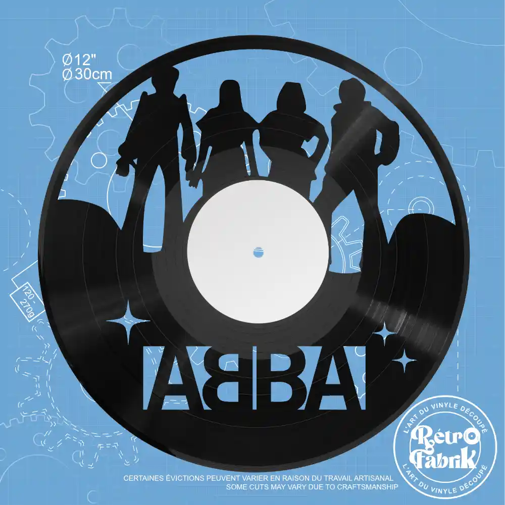 Un vinyle recyclé découpé à la forme d’ABBA, avec le logo emblématique et les silhouettes du groupe. Une création artisanale originale, idéale pour une déco rétro et musicale. 🎶❤️🔥
