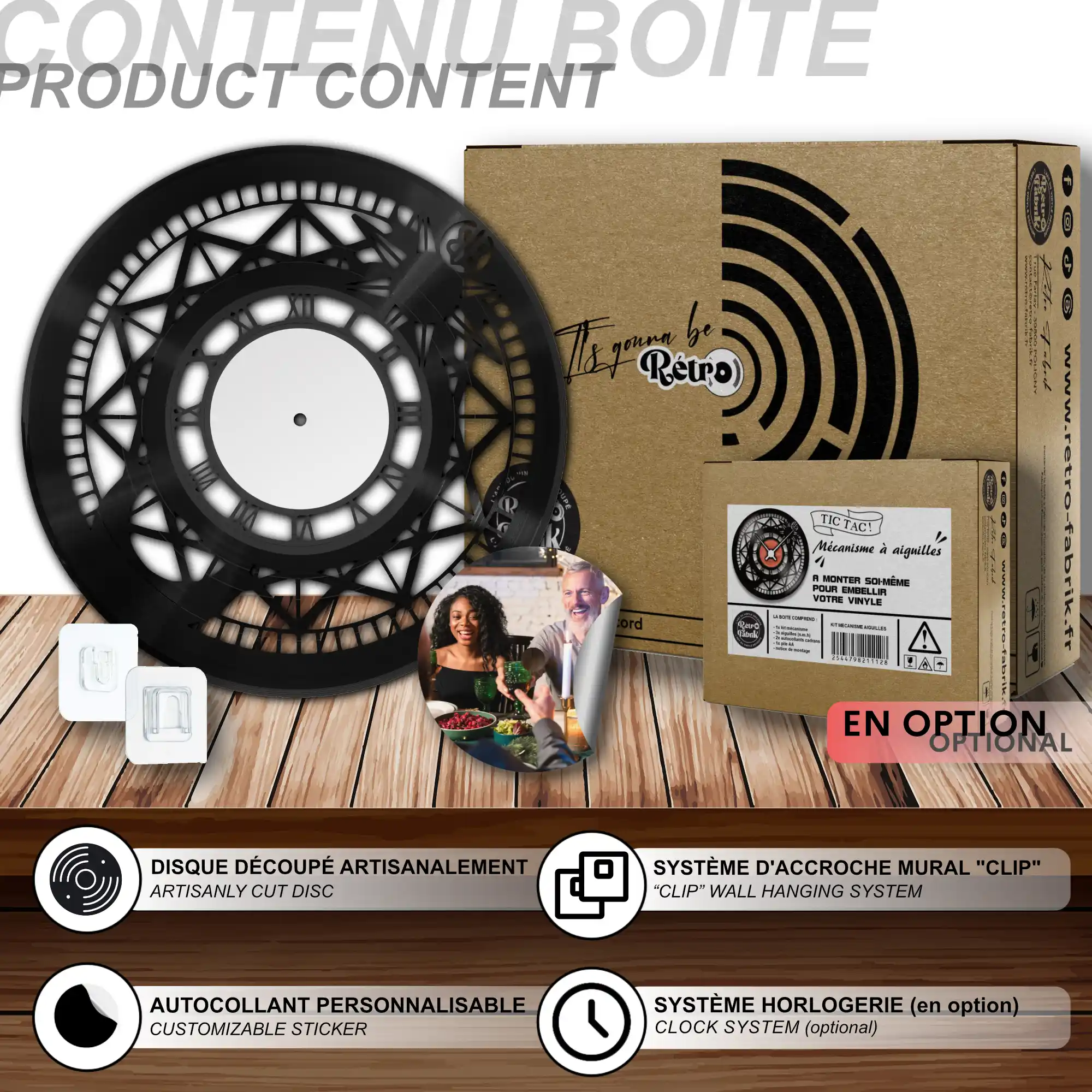 - 1 système d’accroche (compatible avec le vinyle seul et le mécanisme d’horloge)