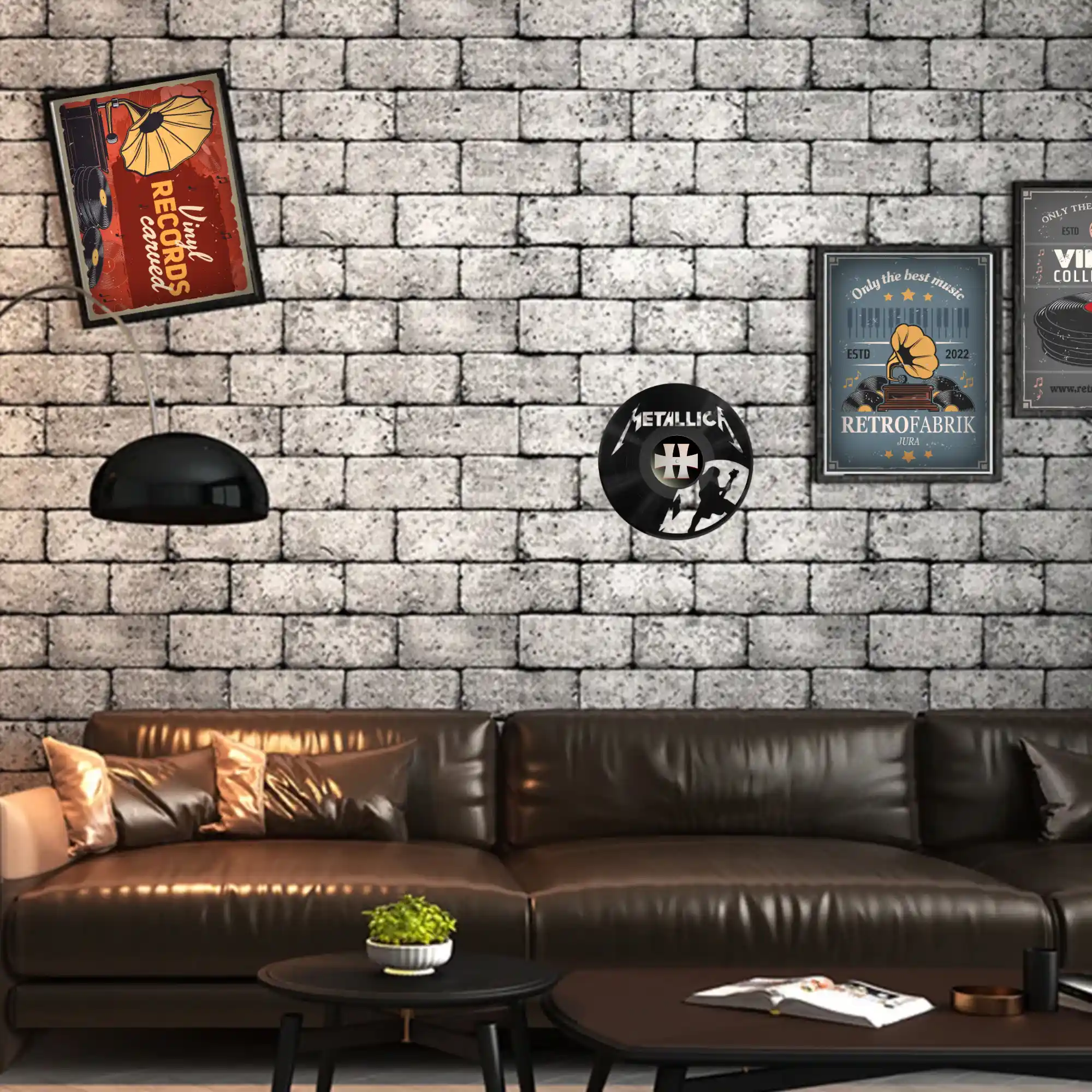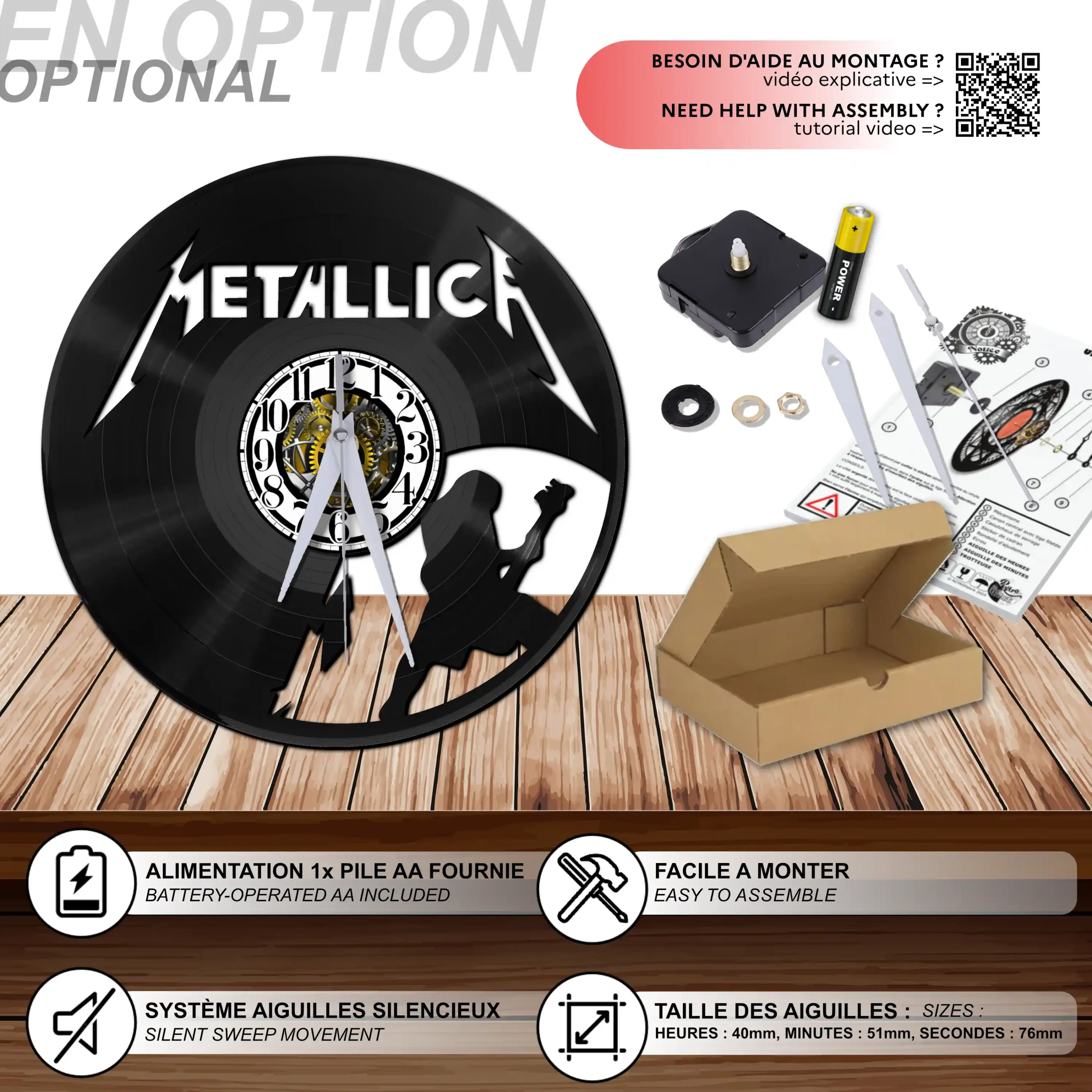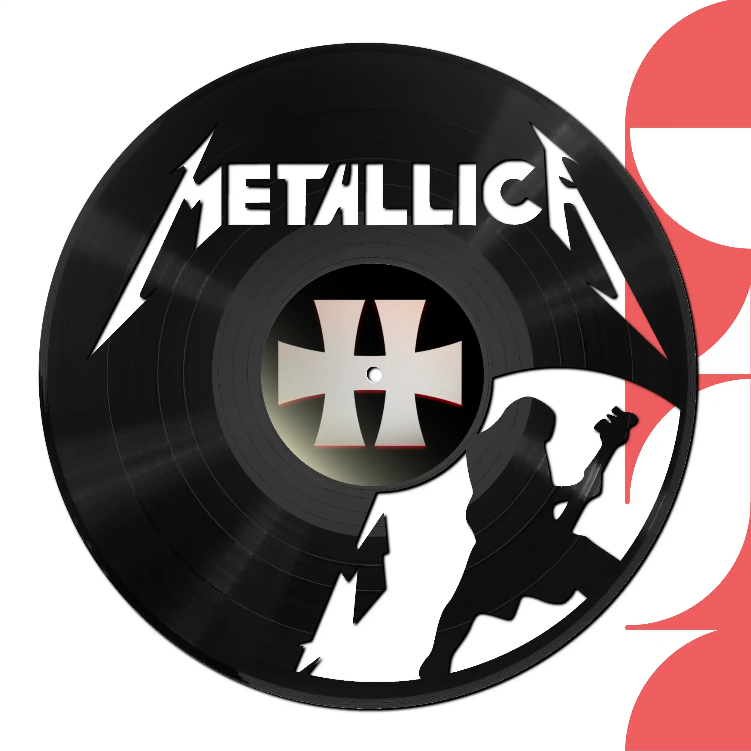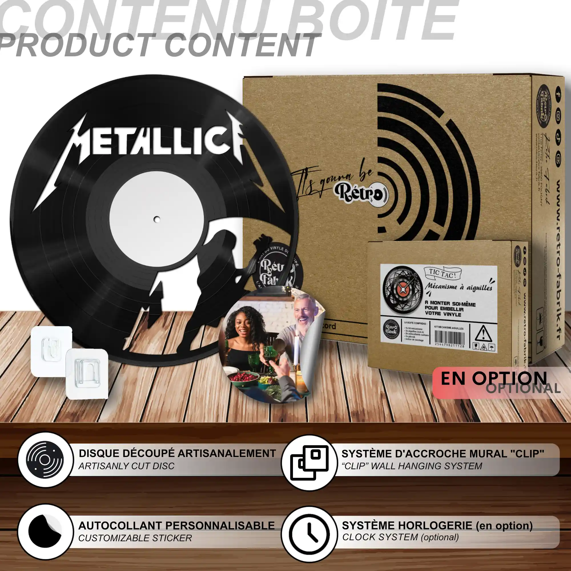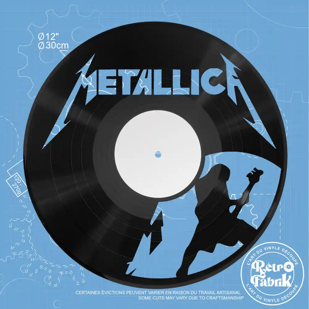 Un disque vinyle recyclé 33 tours découpé à la forme de Metallica, avec le logo iconique et la silhouette du guitariste. Une pièce artisanale unique, parfaite pour les fans et la déco rock. 🎸🎤🎵🤘🏻