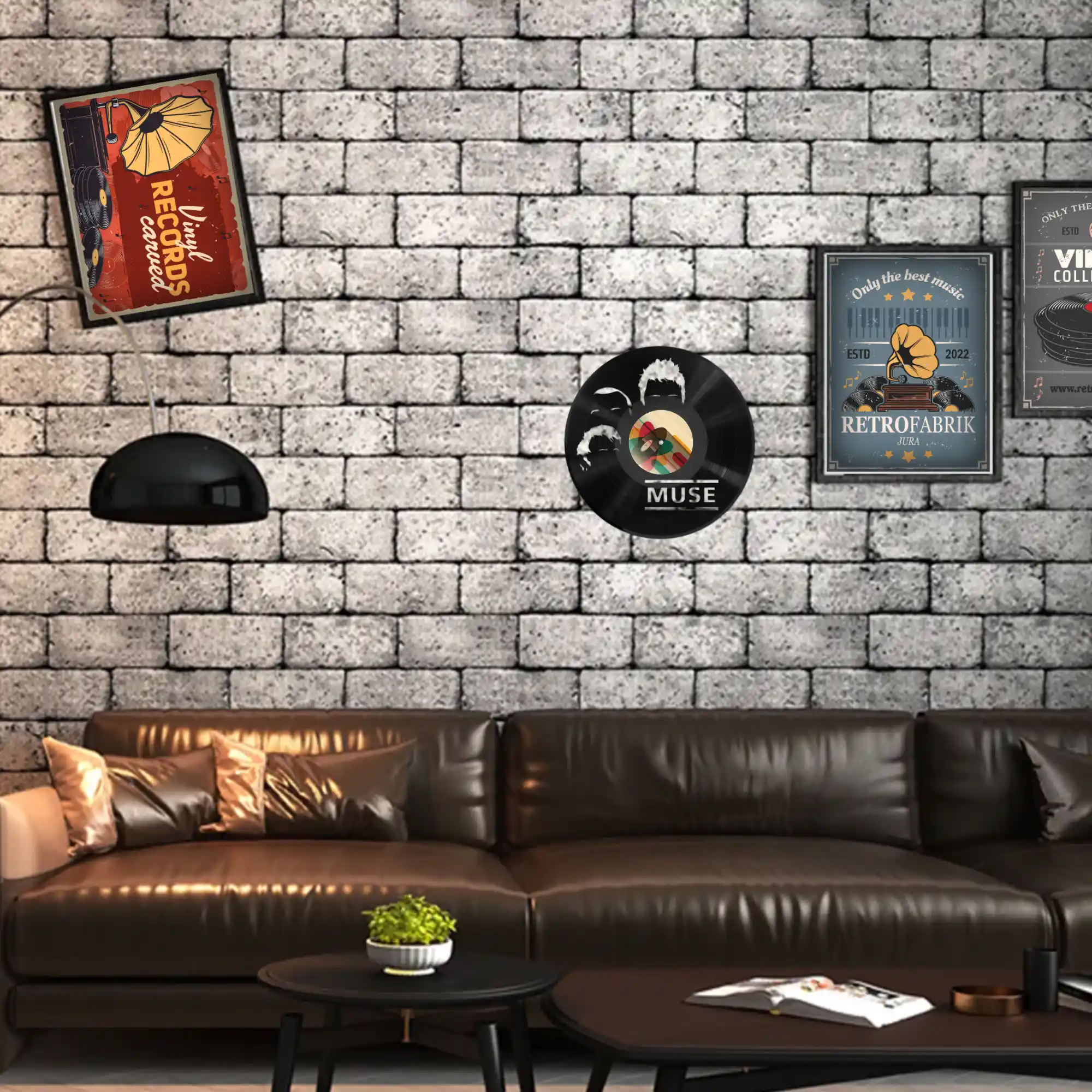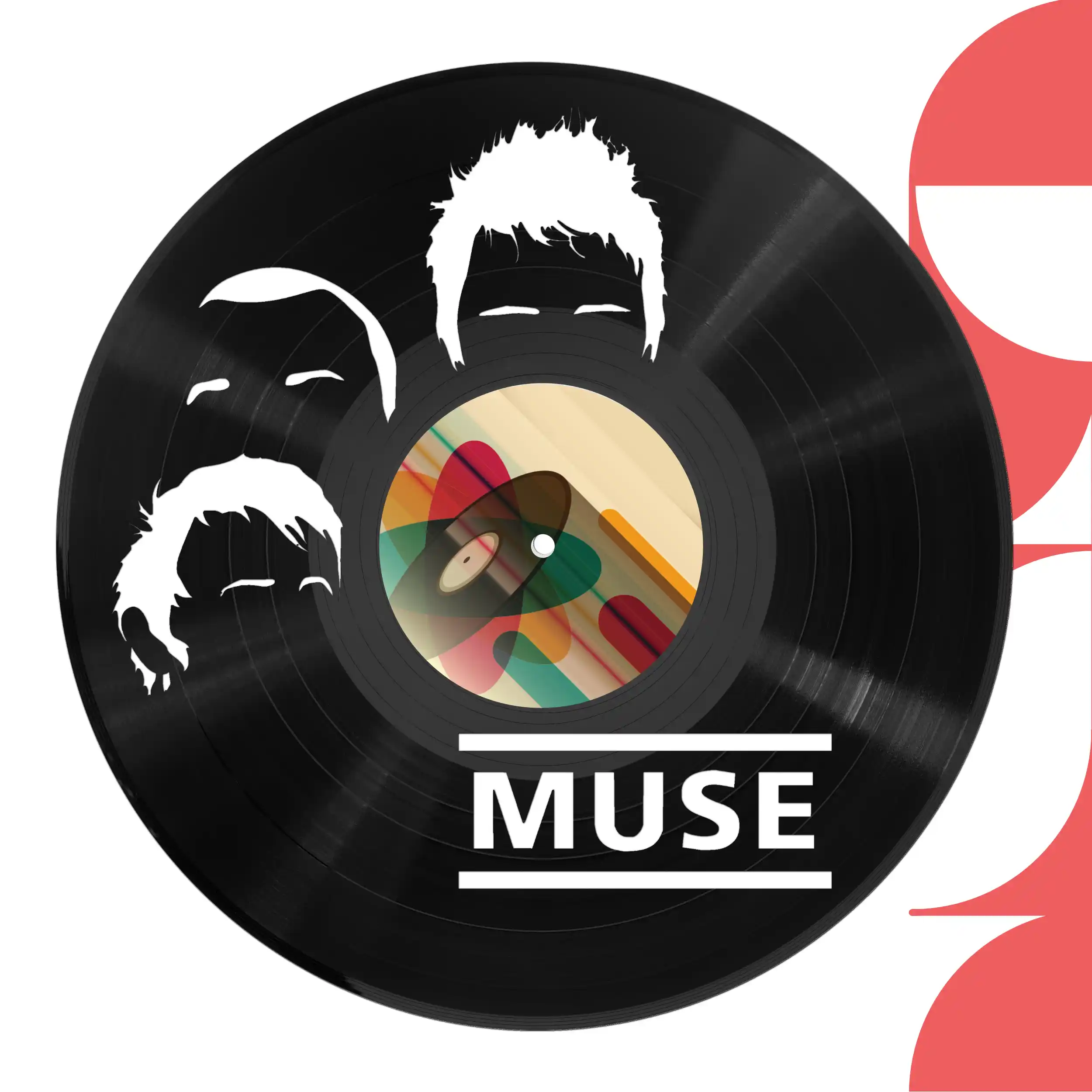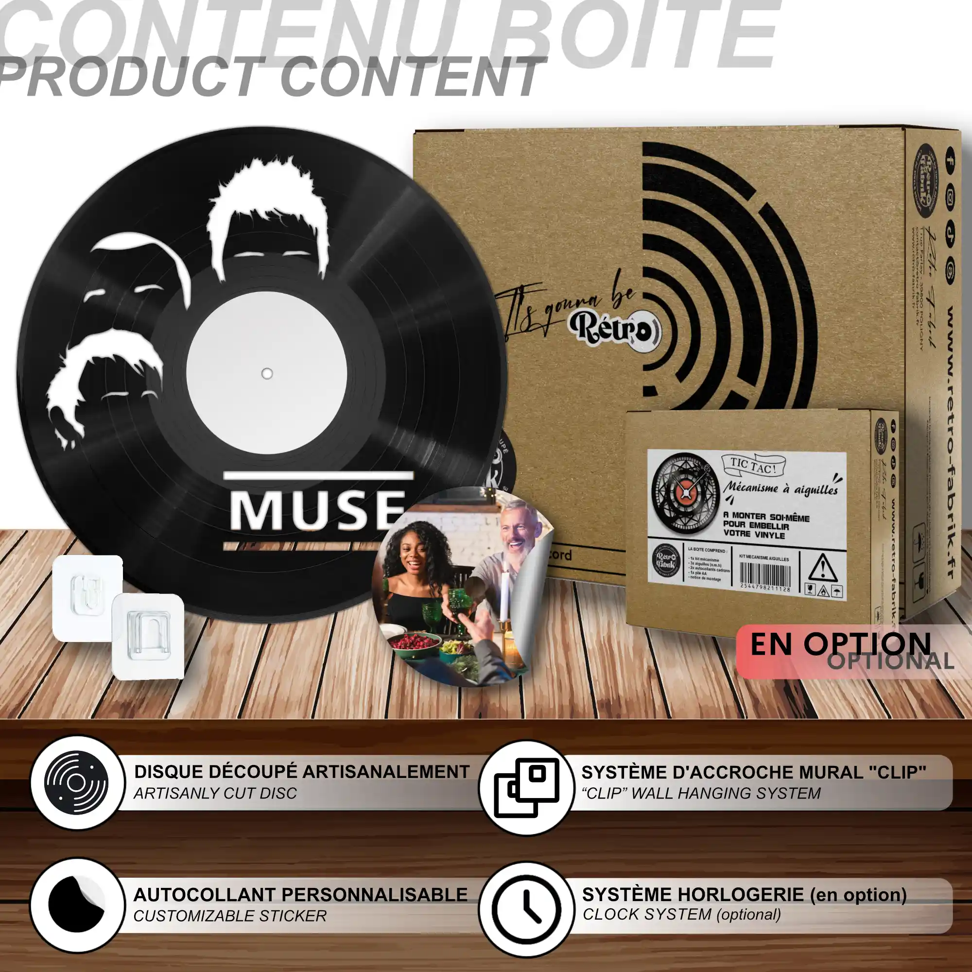 Un vinyle recyclé découpé à la forme des silhouettes du trio Muse, groupe de rock soft des années 2000's. Le logo tranche de par sa simplicité extrême. La décoration murale parfaite pour les fans de Twilight ou pas... Rend magnifiquement bien avec l'horloge en option. 🎵🎙️🎸
