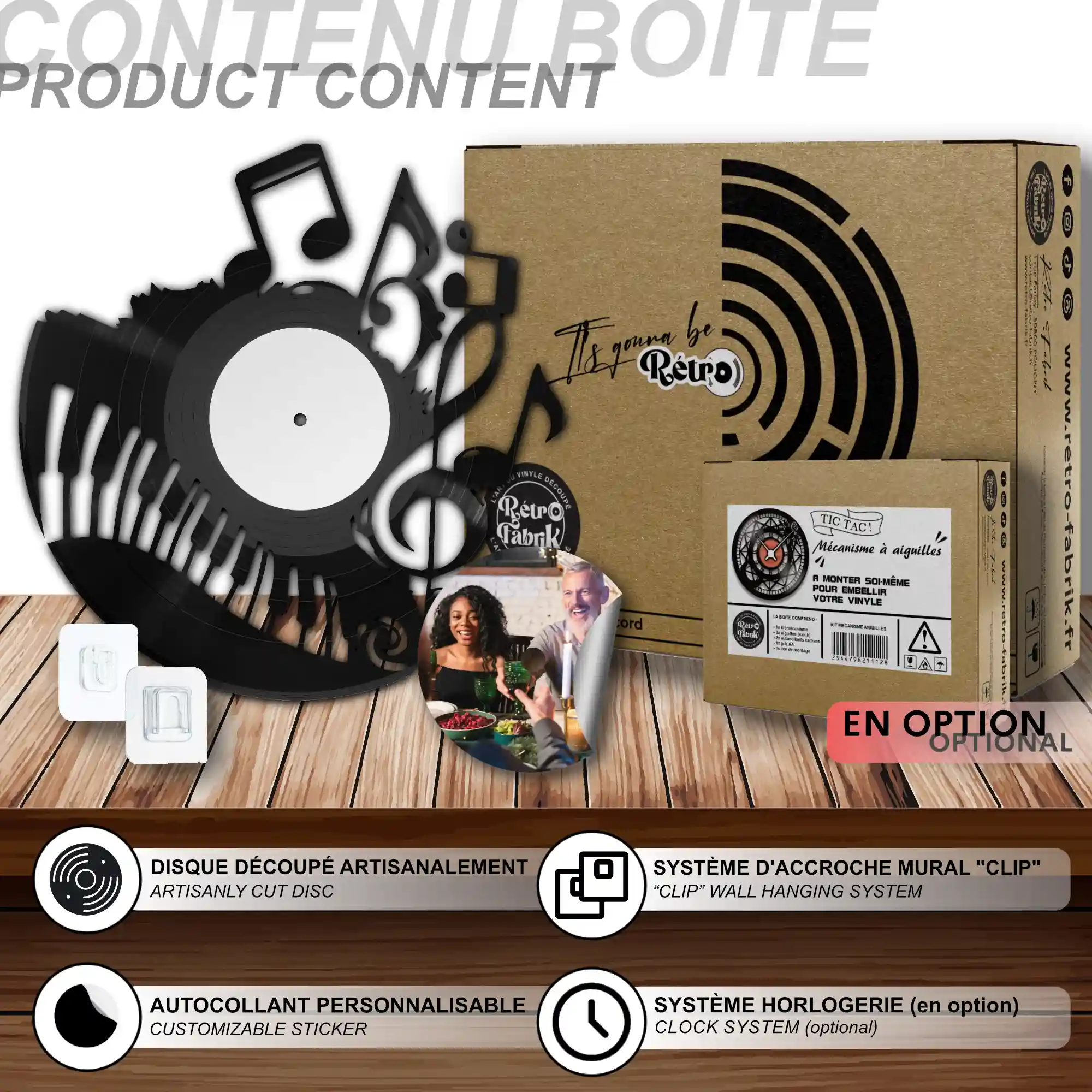 - 1 système d’accroche (compatible avec le vinyle seul et le mécanisme d’horloge)