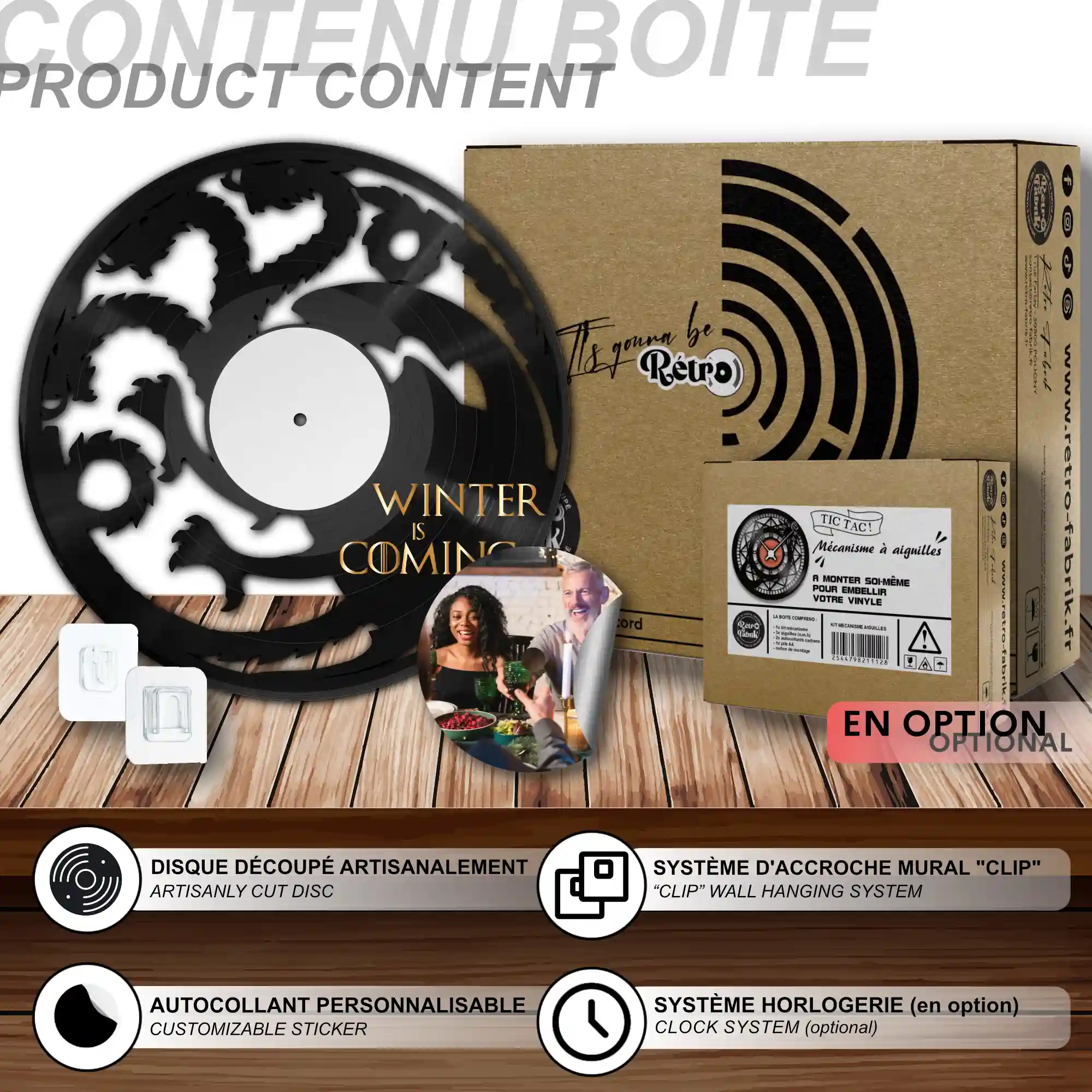 - 1 système d’accroche (compatible avec le vinyle seul et le mécanisme d’horloge)